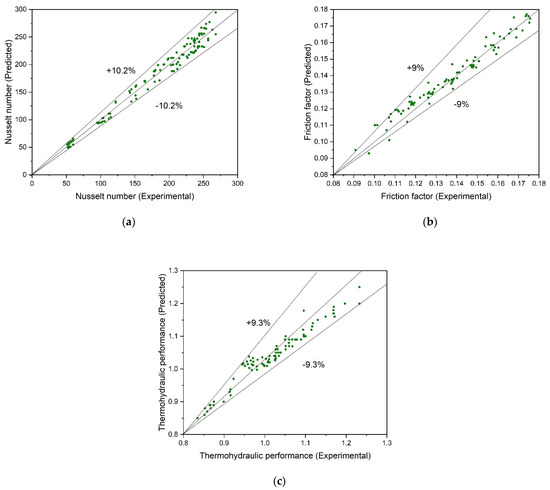 In order to determine the variation between the experimental and predicted data of , a comparative analysis is carried out, and the outcome is represented in are presented in Figure 12a–c. The difference of experimental and predicted data of has an average deviation of ±10.2%, ±9% and ±9.3%, respectively.