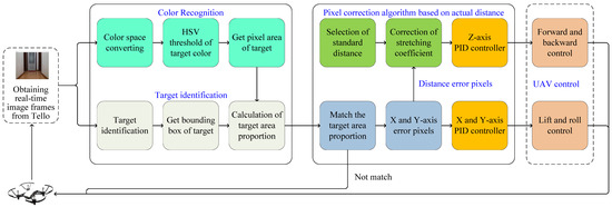 The UAV collects the video stream through the equipped front camera, and the system terminal processes the returned image. By identifying the fixed target, the UAV can fly stably near the geometric center of the target. During the flight, the images captured by the UAV will appear blurry. Therefore, the color recognition algorithm is used to optimize the target identification to improve the accuracy. The main process of identification is as follows.