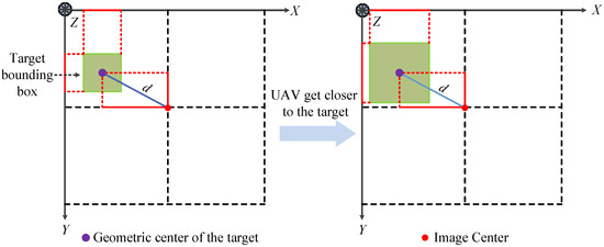 As shown in Figure 2, the distance from two image frames targeting the geometric center to center of the image is expressed by d, while observing the right target area is larger, which means the UAV is closer to the target plane, then the speed of the UAV adjustment should be smaller. The UAV speed (up and down, left and right) has a linear positive correlation with pixel distance, and the pixel distance in the two images is the same; therefore, the speed control command issued by the UAV is exactly the same, which is inconsistent with the actual situation, so it needs to be modified. Thus, while the UAV is closer to the target plane, the pixel distance should be reduced proportionally.