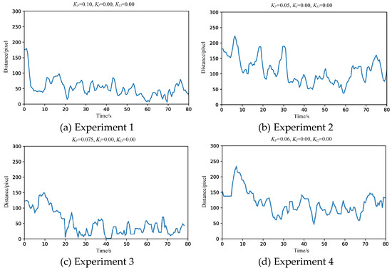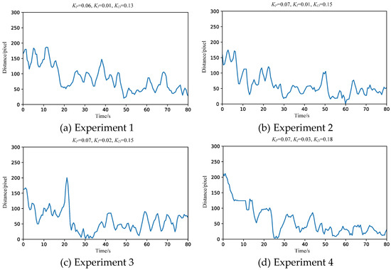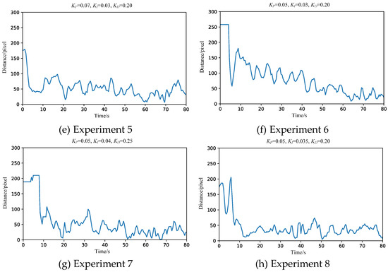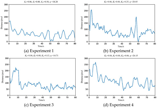 By analyzing experimental data, it can be seen that when KP value is too large (KP > 0.1), UAV power is too large, and it is easy to generate vibration, so that UAV flies out of the range of identifiable targets, resulting in the inability to identify target, and the experimental data is less than 80 s. After that, the value of KP (Figure 7a–d) was determined by the dichotomization method in the experiment. After comparison, while KP = 0.06, UAV has sufficient power and moderate size.