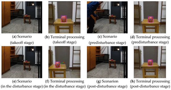 The whole experiment was divided into four stages. The scene diagram and system terminal processing diagram of the takeoff stage are shown in Figure 10a,b. The UAV is in a stable state, and the center of the image frame coincides with the geometric center of object. The scene diagram and the system terminal processing diagram of the predisturbance stage are shown in Figure 10c,d. The state of external interference of the UAV is simulated by manually pulling the string. The scene diagram and the system terminal processing diagram of the disturbance stage are shown in Figure 10e,f. The UAV is pulled to the right, then the center of the target object shifts to the left, so the UAV is in the disturbed state. The scene diagram and system terminal processing diagram of the post-disturbance stage are shown in Figure 10g,h. The UAV is restored to the stable state through the pixel correction algorithm, which is consistent with the takeoff state.