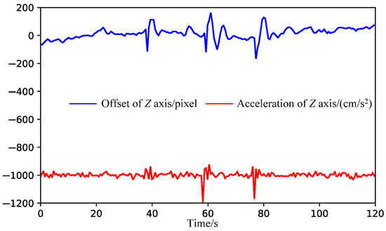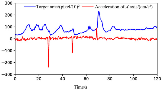 In this experiment, the direction of force applied to the UAV was the X axis direction of the UAV coordinate system. At the same time, the acceleration of the UAV in the X axis direction and the size of the target pixel area were recorded, and the target area identified by the UAV was controlled in the range of 7500–10,000 units.
