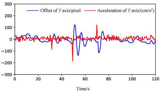 Observing the experimental results, it can be seen that a force of about 6.96 × 10−2 N is applied to UAV at t = 31.6 s, which makes UAV produce an acceleration of −87 cm/s2 in the Y axis, which has little impact on UAV. The pixel offset of the Y axis reaches 66 units, and UAV returns to a stable state after 7 s.