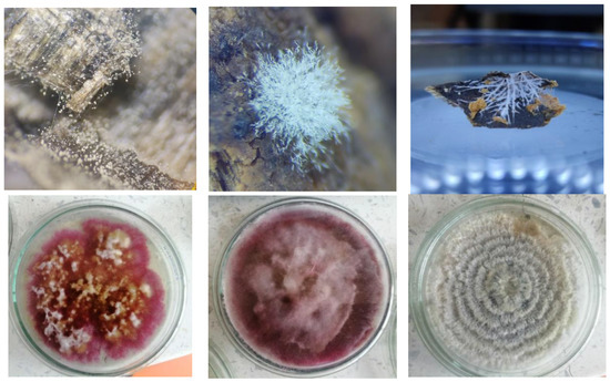 Xylophagous fungi observed in the stereoscope before and after their isolation.