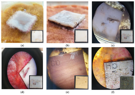Xylophagous fungi growth in the different composite materials: (a) 10% fique fiber-reinforced HDPE; (b) 10% plantain fiber-reinforced HDPE, (c) 15% goose feather fiber-reinforced HDPE, (d) 10% goose feather fiber-reinforced HDPE, (e) pine wood (control material), and (f) recycled plastic.