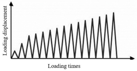 The variation laws of the stress–strain relationship curves of concrete corroded by hydrochloric acid were obtained mainly in the test from the perspective of static load, and thus the test was controlled by displacement load to investigate the mechanical properties of concrete specimens with various corrosion durations. After the pre-loading, the vertical pressure force with a speed of 0.3 mm/min was applied during the monotonic load. Once the vertical stress reached the predicted peak value of 70~90% (12 N/mm2), the loading speed was reduced to 0.1 mm/min until the specimen was destroyed. Meanwhile, the cyclic load tests of specimens were carried out by adapting the displacement control method similar to the monotonic load. To this end, the displacement control was performed, and the speed was selected as 0.3 mm/min during loading, and the displacement increment was 0.05 mm. However, force control was adopted for the unloading stage, and the unloading speed was 3 kN/s until the specimen failed. The loading mechanism of the cyclic load is shown in Figure 2.