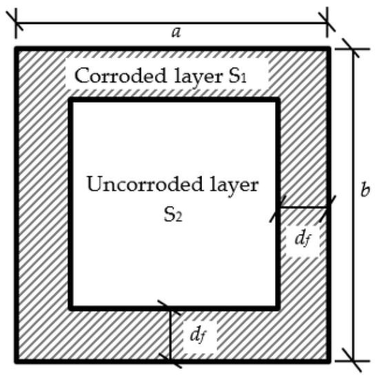 where S1 and S2 represent the section area of the uncorroded and corroded concrete layers, respectively. df represents the strength degradation depth of concrete, and a represents the side length of the concrete cross-section.