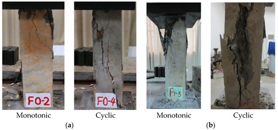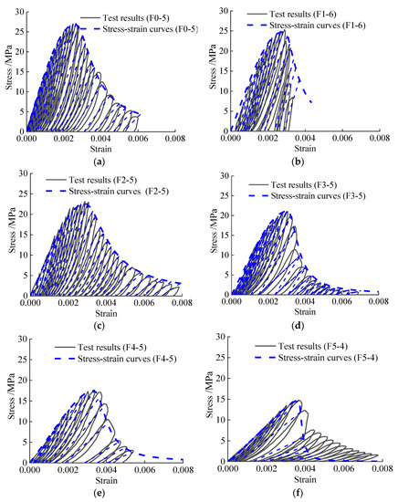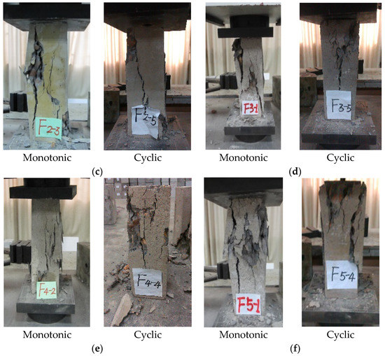 Figure 4 shows the failure modes of specimens with various hydrochloric acid corrosion durations under monotonic and cyclic loads. It can be seen from Figure 4 that the failure modes of all test specimens under monotonic and cyclic loads were essentially similar, which presented that the concrete was crushed severely; that is, the concrete specimens reached the ultimate compressive strain and, thus, the specimen failure. During loading, the first visible vertical crack appeared on the concrete surface when the vertical load reached 60% or 70% of the concrete compressive strength. As the load increased, several new cracks emerged and extended gradually, the number of cracks increased significantly, and the width of cracks enlarged rapidly. When the load approached the compressive strength, the concrete specimen was divided into several blocks by penetrating cracks and seriously crushed, and the vertical deformation was relatively larger. As can be seen in Figure 4a,b, there was no significant difference in the failure mode between the uncorroded concrete specimen (F0) and the concrete specimen with a corrosion duration of 6 d (F1). Large areas of concrete spalling were observed, and the crack extension and propagation in F0 and F1 were sufficient. When the acid corrosion duration reached 12 d or 18 d, some short and narrow, and irregular cracks were found at the concrete specimen’s surface under axial compression, and several micro-cracks appeared inside the concrete. Meanwhile, the concrete specimen has a local crushing phenomenon, large areas of concrete were crushed, and the crack extension and evolution of F2 and F3 were relatively insufficient compared to the uncorroded specimens F0, as depicted in Figure 4c,d. For acid-severely corroded concrete specimens F4 and F5 (corrosion durations of 24 d and 30 d), a large number of obvious cracks rapidly developed after the first crack (main crack) appeared, and the main crack continued to extend and widen. When the concrete specimen was close to failure, the surface of the concrete showed drum-shaped, and the main vertical crack penetrated the specimen, with a width of around 3 mm, as shown in Figure 4e,f.