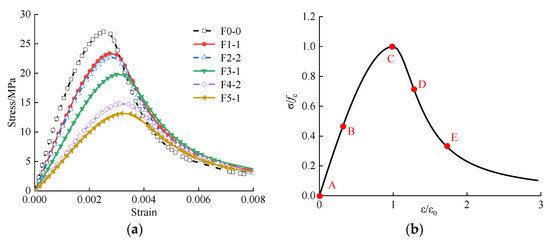 As noted previously, three specimens in each group showed similar failure modes under monotonic load, and thus one concrete specimen in each group was selected for comparative analysis of stress–strain curves. The stress–strain curves of uncorroded concrete and concrete with various acid corrosion durations under monotonic load are shown in Figure 5a. To analyze and compare these curves preferably, Figure 5b shows the typical uniaxial compression stress–strain curve of the specimen in a dimensionless coordinate system. From Figure 5a, the variation laws of the stress–strain curves for concrete at each corrosion duration were essentially similar. As can be seen in Figure 5b, the stress–strain curve of uncorroded and corroded concrete specimens under uniaxial compression load could be generally divided into five sections, including the linear elastic section at points A,B, the nonlinear ascending section at points B,C, the nonlinear descending section at points C,D, the reverse bending section at points D,E, and the complete failure section after point E. Point C represented the peak stress point of the specimen, and the relative strain ε/εc was 1. Point D was the approximate inflection point of the curve.