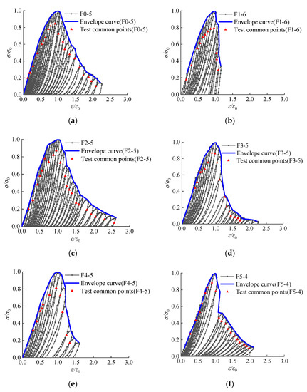 Stress–strain normalized curves of concrete specimens with different acid corrosion durations under cyclic load: (a) 0 d; (b) 6 d; (c) 12 d; (d) 18 d; (e) 24 d; (f) 30 d.