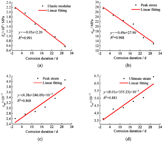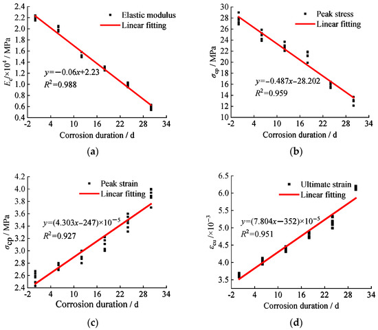 The variation trends of the elastic modulus, peak stress, peak strain, and ultimate strain of concrete with different corrosion durations are depicted in Figure 7. As can be seen in Figure 7, as the acid corrosion duration increased, the elastic modulus and peak stress gradually decreased while the strength degradation depth, ultimate strain, and peak strain enhanced drastically. It was because the chloride ion in the corrosion solution was diffused into the inside concrete to occur the replacement action with the Ca(OH)2 in the cement stone, resulting in a large number of gypsum and ettringite deposited and accumulated in the concrete pores. Meanwhile, the generated salt crystals contained a large amount of crystal water, forming the local expansion pressure in the pores of the concrete. Additionally, the deviation in the water-loss shrinkage deformation capacity between the cement mortar and coarse aggregate in concrete was obvious. Then, the stress concentration at the tip of the internal micro-crack occurred due to the uneven deformation between the cement mortar and coarse aggregate, which made the internal crack of concrete form and presented an obvious loose situation. Under the larger stress, micro-cracks in the concrete gradually expanded or even formed a penetrating crack, which was beneficial to more salt solution deposited into the concrete, and continued to accelerate the performance degradation of concrete. The internal damage to concrete became more obvious, and the strength of corrosion depth continuously enlarged as the acid corrosion duration increased. Accordingly, the peak stress and elastic modulus of the concrete showed an obvious decreasing trend. The deformation capacity of concrete materials increased significantly, and thus the ultimate strain and peak strain increased significantly due to the enhancement of the deformation capacity of concrete [46]. However, to be noted, the peak strain was not the only important indicator reflecting the deformation capacity of concrete material.