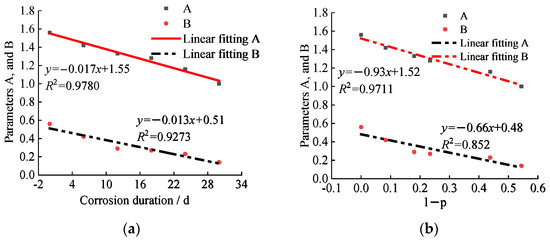 Relationship curves between parameters A, B, and corrosion duration or effective bearing capacity cross-sectional area ratio p: (a) relationship curve between A, B, and corrosion duration; (b) relationship curve between A, B, and 1-p.
