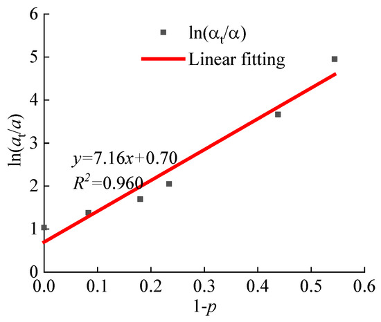 The measured strength degradation depth df and the effective bearing capacity cross-sectional area ratio p of all concrete specimens with different corrosion duration under cyclic load are shown in Figure 11. It can be seen from Figure 11 that the relationship curve between the strength degradation depth of concrete and the acid corrosion duration showed an exponential function. The strength degradation depth was calculated by using Equation (9).