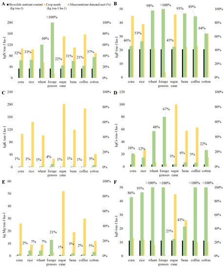 One can observe in Figure 2A, that the N content of IBRS WWTP (of the present research) (33.64 ± 6.08 kgN ton−1) met 32% for corn demand, 33% for rice, 60% for wheat, forage grasses was >100%, for sugar cane 22%, for beans 31%, 21% for coffee, and 37% for cotton. Ref. [45] explained that generally most of N is found in its organic form in biosolids and, therefore, is readily available for plants after the degradation of organic matter.
