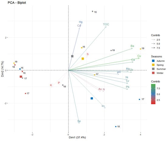 Multivariate analysis, as a tool that allows verification of the interrelationships with a large number of variables, is known for its varied applications, including studies related to biosolids [32,33,34]. According to [35,36], this technique allows for analyzing sets of complex data without information loss. The interpretation of the analysis occurs via the observation of the angular measure formed between the data, where the weight of the variable lies further from the largest center. The larger an angle a lower correlation and the lower angle formed indicative of a high correlation, as opposite variables, too, are inversely correlated [37]. From linear combinations between variables, it seeks to reduce, as well as to eliminate data for better representativeness, which provides a smaller set of variables that is called components. Quantification of the significance of variables allows for an explanation of the groupings, in which new variables, called orthogonal, are explained by a set of data not correlated with each other and reduced, which are the principal components (PCs). Thus, our focus was to analyze whether there was a significant difference or not, between chemical elements and pH within the categories of seasons of the year in the tropical climate.