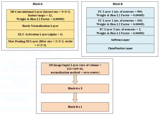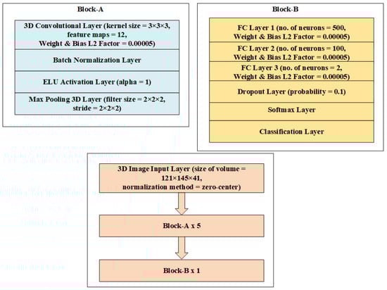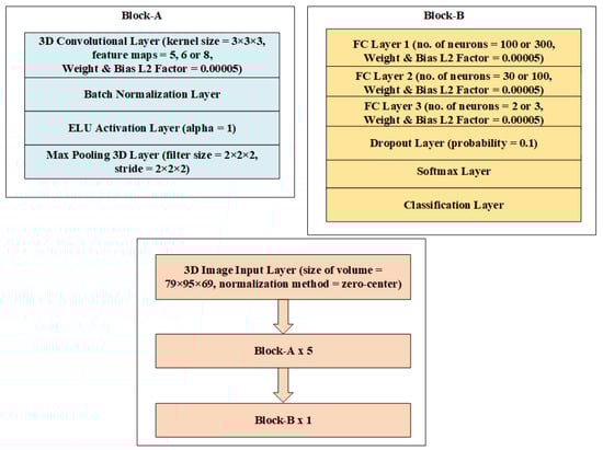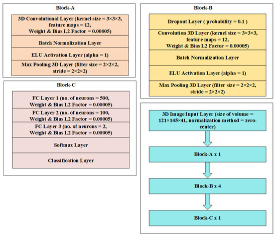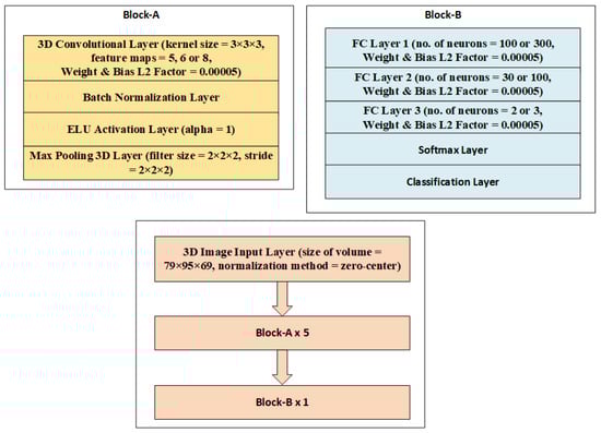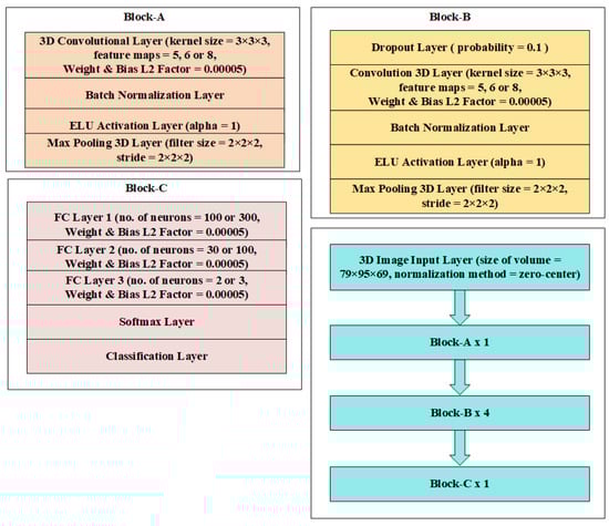 The classification architectures in Figure 3 and Figure 4 are nearly identical to those in Figure 1 and Figure 2, except for a single dropout with a 0.1 probability right before the softmax layer in the entire design, which randomly removes neurons acting as the regularizer to minimize overfitting. Figure 5 and Figure 6 depict structures that correspond to scenario-3. An input layer in these designs uses the zero-center normalization technique to center volume sizes of 121 × 145 × 41 or 79 × 95 × 69 toward the origin. Following this input, there is a single block labeled “block-A”, four blocks labeled “block-B”, and a single block labeled “block-C”. These blocks are made up of convolutional, batch normalization, dropout layers, max-pooling layers, FC, ELU activation, and softmax layers, as shown in Figure 5 and Figure 6.