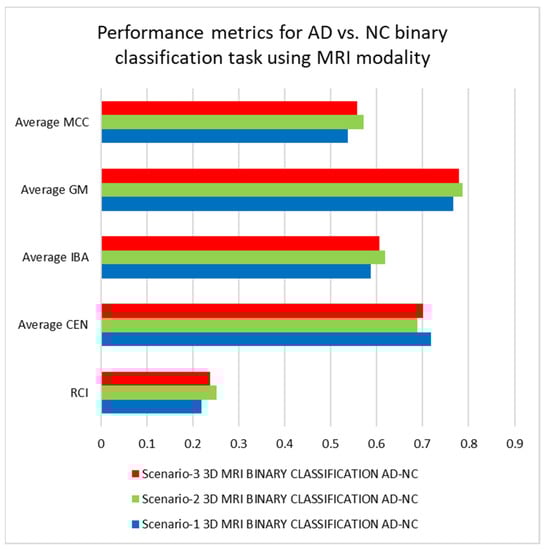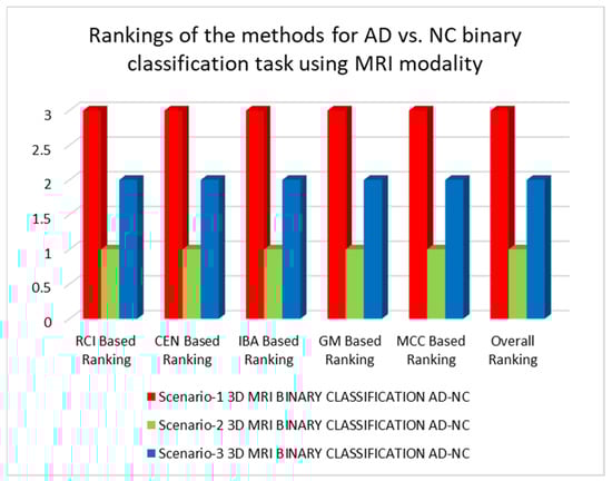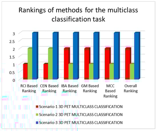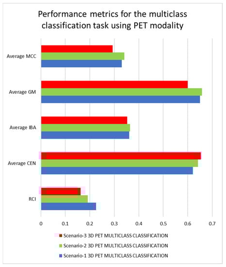 The results of the tests, as shown in Table 3, Table 4, Table 5 and Table 6, will now be discussed. Table 3 shows that the structures used in scenarios-1 and 2 significantly reduce the disharmony between batch normalization and dropout methods for multiclass classification between AD, MCI, and NC classes using PET modalities, whereas scenario-3 significantly increases it. The best architecture, according to RCI and average CEN metrics, is 3D-CNN in scenario-1, while the worst performing architecture is 3D-CNN in scenario-3 using PET modality. Based on average IBA, GM, and MCC measures, the 3D-CNN trained under scenario-2 has the better performance, whereas the 3D-CNN trained under scenario-3 using the PET modality has the worst performance. Generally, the best-performing architecture is the 3D-CNN trained under scenario-2, whereas the worst-performing architecture is the 3D-CNN trained under scenario-3 using the PET modality. Because of the better performance of the 3D-CNN trained under scenario-2, which employs the PET modality, we can observe that dropout and batch normalization together may yield higher performance outcomes. It is also worth noting that the architecture trained under scenario-3 had the worst results, which could be explained by the disharmony in the dropout and batch normalization methods, which have lowered performances in this case due to the internal covariance shift phenomenon, which caused these methods to behave differently during the training and test phases of the neuronal units [43]. The results and rankings of the architectures trained under the three scenarios for the multiclass classification task are given in Figure 7 and Figure 8.