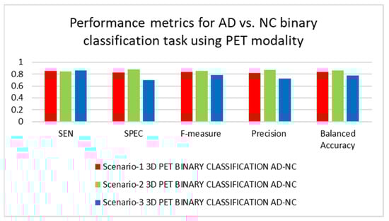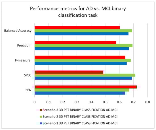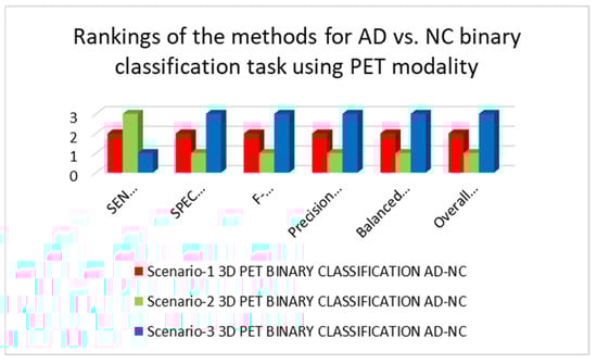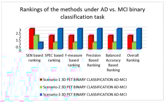 Table 4 illustrates the binary classification outcomes between AD and MCI classes, applying the PET modality for the trained 3D-CNN architectures in each of the three scenarios. The 3D-CNN architecture trained under scenario-3 performed the best, whereas the 3D-CNN architecture trained under scenario-1 performed the poorest while considering only the SEN metric. Overall, the trained 3D-CNN architecture in scenario-2 yielded the best results, whereas the 3D-CNN architecture trained under scenario-3 yielded the worst results. These results illustrate the benefits of combining batch normalization and dropout approaches. A small value of dropout improves the performance; however, large amount of it reduces the performance. The findings and rankings of the architectures trained for the AD vs. MCI binary classification task in each of the three scenarios are shown in Figure 9 and Figure 10.