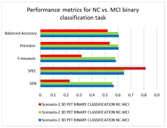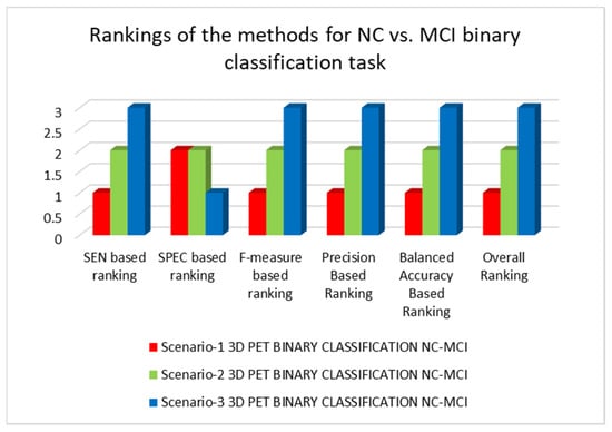 Table 6 shows the data for binary classification among NC and MCI classes using PET modalities. According to SEN, F-measure, SPEC, and balanced accuracy performance metrics, the 3D-CNN model trained under scenario-1 performed the best, while the 3D-CNN model trained under scenario-3 performed the worst. Overall, the 3D-CNN architecture trained under scenario-1 is the best-performing architecture, whereas the 3D-CNN model trained under scenario-3 is the lowest-performing architecture. We notice an interesting trend here: the design with no dropout performed the best, the one with a small value of dropout performed the second best, and the one with a substantial amount of dropout performed the worst. These data show that utilizing dropout sparingly or not at all leads to better-performing designs than using it excessively. Figure 15 and Figure 16 demonstrate the results and rankings of the architectures trained under the three scenarios for the NC vs. MCI binary classification tasks using PET modalities.
