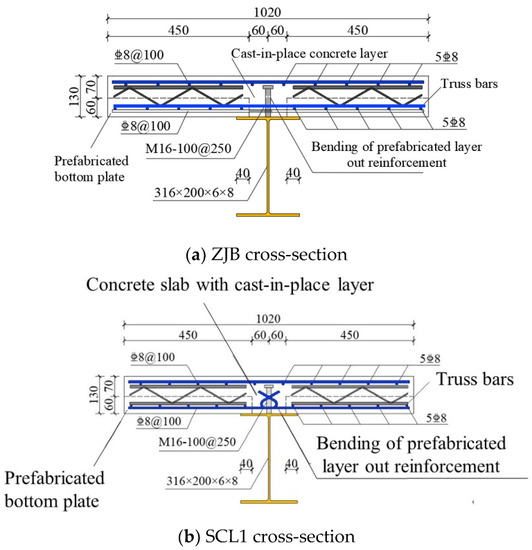 According to the codes [27,28,29], three full-scale composite beam specimens ZJ, SCL1, and SCL2 were designed. The ZJB was a laminated full-cast H-shaped steel-concrete laminated plate composite beam, hereinafter referred to as the full-cast beam. The SCL1 was an H-shaped steel-concrete laminated plate composite beam in the form of the precast bottom plane with bent-up bars, hereinafter referred to as the with reinforcement beam. The SCL2 was an H-shaped steel-concrete laminated plate composite beam in the form of a precast bottom panel with embedded new angle connectors, the specific dimensions of the combined beam are shown in Figure 2.
