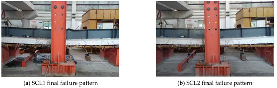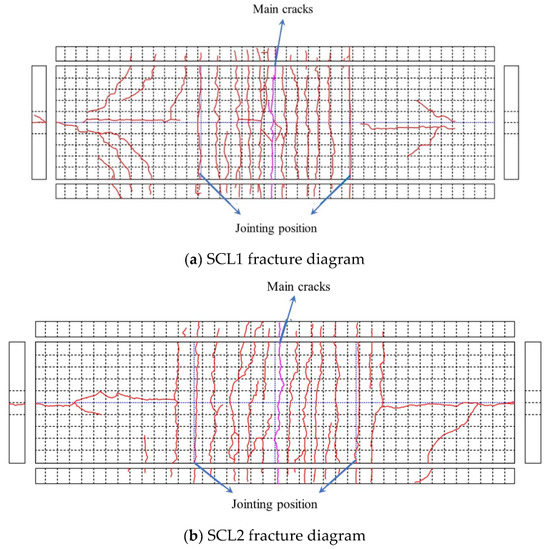 The main cracks in all three sets of composite beams occurred in the mid-span section and the distribution of the cracks shows that the alignment and distribution of the three sets of composite beams were similar. This indicates that the concrete bonding performance between the precast and cast-in-place layers was good and no shear damage along the laminated surface occurred. Between the joint and the support section, transverse cracks appeared, indicating good force transfer at the joint. As the load increased, longitudinal splitting fractures appeared in the shear span zone near the support, and shear cracks occurred in the concrete near the support due to the high pressure transmitted from the steel beam. The SCL2 had fewer shear oblique cracks than SCL1 and ZJB. The reason for this phenomenon is that the connection effect between the concrete slab with angle shear connectors and steel beams was better under the same level of loading and the shear lag effect was more pronounced. Therefore, fewer oblique cracks appeared in the supporting section than in the outgoing reinforcement. According to the literature [35], the precast bottom panel out reinforcement helps to stop longitudinal splitting cracks, which demonstrates the effect of the angle connectors in inhibiting longitudinal splitting cracks in the steel-laminated plate combination beams. This again verifies that the transverse reinforcement has the effect of inhibiting longitudinal splitting cracks. Please see Figure 17 for the exact distribution of cracks.