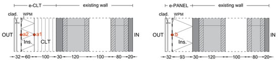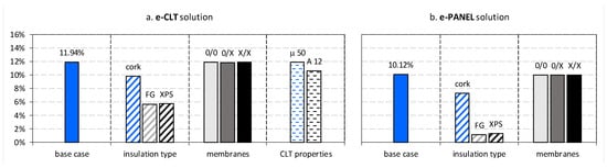 In general, the results for the e-CLT and e-PANEL follow the same trend. Considering the scenarios where the insulation type is tested, the difference in the MI between the solutions is negligible, especially for the CORK, the FG, and the XPS. Nevertheless, in the presence of WF, the e-PANEL assembly ensures a very slight better performance than the e-CLT assembly.