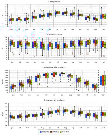 Figure 3 shows the comparison between the climate datasets selected as MRYs (COLD, HOT, and RAINY), considering the monthly and yearly statistical distribution of the dry bulb temperature, the relative humidity, the global solar irradiation, and the long wave sky irradiance. These data are plotted by means of boxplots, where the vertical boxes identify the interquartile range, i.e., they are limited by the first (lower) and the third (upper) quartiles. The horizontal segment and the cross inside each box are respectively the median and mean value. The whiskers (vertical lines) include the entire range of values, except for the outliers, i.e., the values that deviate from the upper/lower interquartile range by more than 1.5 times the interquartile extension (outliers are represented by circles).