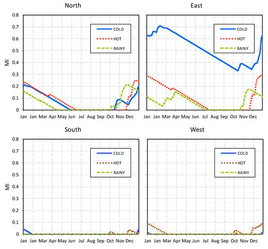 Figure 4, the COLD year ensures the worst performance, in terms of mold growth (maximum MI = 0.71) in an east-orientated façade. The results suggest also that the effect of the climate dataset and of the wall orientation on the moisture-dependent U-value is negligible. In fact, the increase in the U-value ranges from about 11.10% to 12.10%, compared to the dry case. For these reasons, the COLD year is selected as the MRY and east is selected as the critical orientation for the wall.