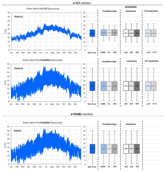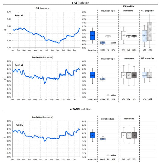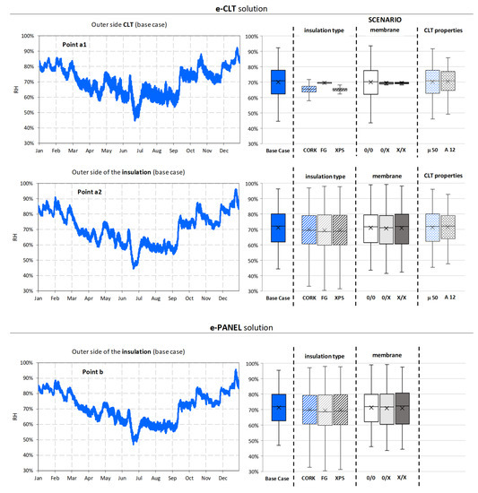 Considering the e-CLT base case, the temperature ranges from about 10 °C to 32 °C in point a1, and from about 1 °C to 42 °C in point a2. Instead, the RH can exceed 80% between October and March in both points, reaching 96% in point a2. In the winter, point a1 keeps at a lower temperature and a slightly lower RH than point a2, thus suggesting that the insulation layer is more exposed to mold-risk than the CLT layer.