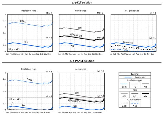 Figure 7 shows the time trend of the MI: this plot compares each scenario to the base case for both solutions (i.e., e-CLT and e-PANEL). The trends refer only to the outer side of the insulation, since the MI in the outer side of the CLT never exceeds 0.3, and has not been reported for the sake of conciseness.