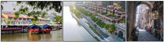 Singapore River (Left), Shanghai Suzhou River (Middle) and traditional neighborhood in Naples (Right). Source: Photos from the Qunar website (Left); Google map (Middle); the authors (Right).