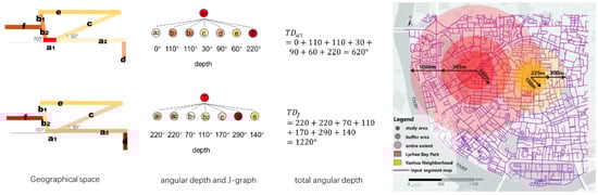 In the Space Syntax theory, space is the sum of spatial relationships. The first step for Space Syntax modeling is defining the remapping relationship of geographical spaces. Secondly, a J-graph without coordinates and other attributes is outputted. The J-graph listed the angular degrees (or the angular depth, represents the inaccessibility) of a certain space (Figure 3 uses Space #a1 and Space #f as example) and all other spaces. Thirdly, by adding all the angular depths up, one can get the total angular depth, which is the core index that measures the inaccessibility of a space. Associated indices like Total Angular Depth, Mean Depth, Choice, Connectivity, Integration etc. are calculated for further simulation (detailed formula and derivation in Table A1 in Appendix A). An extent equal to the study area plus a buffer area is applied in the simulation to avoid the edge effect. The buffer area is 1.5 times the one of the study area (Figure 3). When it comes to the choice on topological mapping using the axial map and segment map, it is found that the Axial Map has two limitations: (1) it omits the geographical scale; (2) different segments of a street may have different spatial relationships; because in the Axial Map a street represents only one element, the error would be bigger for micro-scale analysis. On the other hand, the Segment Map makes improvement to these aspects by cutting a line into the segments and treating them as different elements. For this study, which engages the sites at a micro-scale, the Segment Map is thus preferable. For the Integration and Choice analysis of the streets in the two sites, only those streets within the 1000 m radius are included in the computation to simulate accessibility by walking in the public space. NAIN and NACH represent the centrality of a street/road segment or space deployed (Note that there is no difference between street and road in this study).