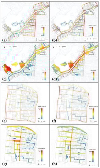 Analysis of (a) Integration (b) Choice (c) Visual Isovist (d) Visual Integration in Lychee Bay Park; (e) Integration (f) Choice (g) Visual Isovist (h) Visual Integration in the Yaohua Neighborhood.