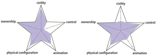 - Civility: Civility indicates the managerial aspect of publicness by implicit tactics. The key criterion of publicness is that a place is well cared for [,,].