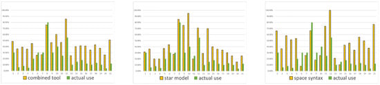 Secondly, the combined tool (equations in Section 3.2.5) adopts the concept of integrating Space Syntax based on the framework of the Star Model but extends its scope of application from a mesoscopic scale to a micro scale. “Animation” assessed by green ratio, and seating and “physical configuration” assessed by Space Syntax are combined to evaluate the publicness of the POS. The results are verified to be more effective and accurate when compared with merely using the Star Model or Space Syntax (Figure 8). Because the score of the actual use (meaning the popularity of the POS) and three assessment models is not based on the same scoring system, the authors proposed that comparison between the actual use and the models should start from a tendency (curve) comparison; in other words, the relativity. Of the three, it could be seen that the tendency of the combined tool is nearly the same with that of the actual use, while the tendency of the Star Model shares less similarity with that of the actual use. The tendency of the Space Syntax is the most different to that of the actual use. In order to further estimate the accuracy of the combined tool and Star Model, the standard deviation of the difference between the actual use scoring and assessed scoring (the combined tool scoring and Star Model scoring, respectively) are calculated. The standard deviations are 0.1197 and 0.1613 of the combined tool and Star Model, respectively. The combined tool assessment result has better fitting with the actual use. Thus, the combined tool contributes by producing a more accurate level. Here the formula of standard deviation is , where  is the value of the  point in the data set, n is the sample size and the value of the  point is the  difference in the actual use scoring and combined tool scoring or the Star Model scoring. The lower standard deviation means the better the fit to the actual use of the assessment.