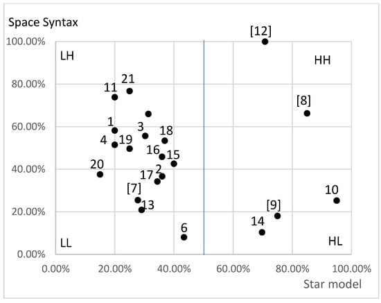 Two-dimensional graph of POS by the composite publicness index. Notes: HH refers to higher scores in both the Space Syntax and Star model; HL refers to higher scores in the Star model and lower scores in Space Syntax; LH refers to lower scores in the Star model and higher scores in Space Syntax; LL refers to both lower scores in Space Syntax and the Star model. The threshold value of high and low scores is 50%. POS is in the shape of a square, marked with [square] brackets.