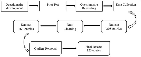 In Part 3, the selected from the literature sustainability indicators were categorized into environmental (10 indicators), social (8 indicators), and economic (7 indicators) criteria. The questionnaire was distributed among 205 experts through email, fax, or directly handed over to them. They were experts from the construction industry with more than 5 years of experience in the industry. Respondents (infrastructure projects experts) were invited to value these indicators for infrastructure projects. The elements given to them include the importance, practicality, reliability, and relevance of the indicators for their infrastructure projects. The elements of scrutiny were defined on the scale as “High, Normal, Less, and Not” and the choice of “No Opinion” if the respondent has no understanding of the selected indicators. Furthermore, we also asked the respondents about the importance of socioeconomic and environmental aspects of sustainability. This question was asked to understand the intention of the construction industry for sustainability in the context of Gulf states. A total of 174 responses were returned, of which 11 were incomplete so 163 questionnaires were further analyzed. Before starting the analysis, outlier statistics were carried out to identify outliers. A total of 38 outliers were detected and removed from the dataset. 125 questionnaires were left in our dataset for further analysis. Figure 2 shows the process of questionnaire development and data collection process.