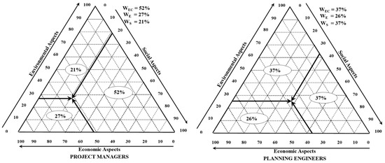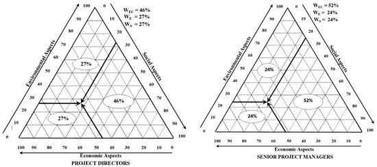 Finally, the experts were questioned concerning the ranking of the three most important sustainability dimensions. These dimensions are discussed in the majority of studies that emphasize sustainable development in infrastructure projects. The below figures illustrate the weighting sets of the sustainability aspects, i.e., the triple bottom line approach of sustainability. The life cycle sustainability aspects are illustrated in the triangles implemented by Hofstetter et al. [80] to weigh different environmental forces caused by the problems of chemical mixtures. This may perhaps be practical to weigh any triplet elements [81].