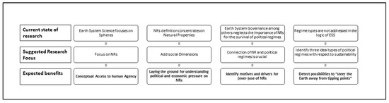 In this article, we are proposing a resource perspective to better understand the human factor in Earth system models as well as the link between resource use and political power. We argue that political power will more and more depend on regimes that ensure access and sustainable use of NRs. As natural support systems are approaching tipping points, so do political systems that depend on natural services. The agenda complements the existing approaches that aim to add a social dimension to the study of Earth systems. With regard to the ESG project, the NR approach fills a gap as the material underpinnings of Earth governance were undertheorized. The “social boundaries” approach is more concerned with negotiation processes between critical stakeholders and engages less with the interface between natural and social systems that we are concerned with. In this article, we suggested a four-step study program.