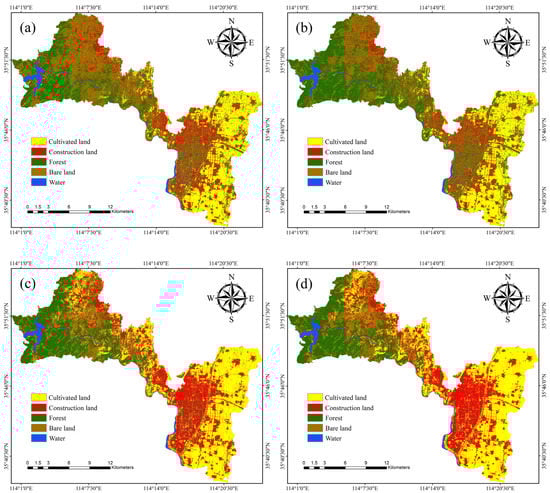 For the training sample selection, we follow the national land cover classification standards [36,37]. The land-use types are first classified into five categories: Cultivated land, construction land, forest, bare land, and water. Table 1 describes the five land-use categories. The training and validation samples in this study are obtained from field surveys and visual interpretation of remote-sensing images: (1) field survey of the study area from March to April 2021 recorded with a handheld global positioning system with an acquisition accuracy of <5 m; (2) selection of sample points (using ENVI 5.3 software) for the five land-use categories based on the April 2021 satellite image of GF-2 and field survey data. Finally, 200 regions of interest (ROIs) were selected for each land-use category by combining field surveys and visual interpretations of remote-sensing images.