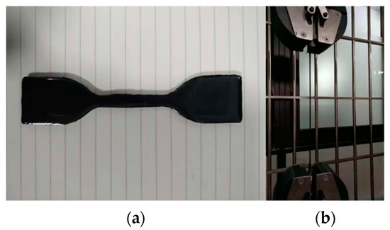 The strength and deformation ability of epoxy asphalt mastic were tested using tensile test (ASTM D638). The test temperature was 23 °C, and the loading rate was 500 mm/min. The test was conducted using a universal material testing machine, and the tensile strength and elongation at break of the epoxy asphalt mastic were calculated. Photos of the experiment are shown in Figure 2.