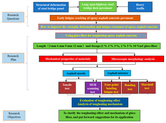 - In the future, we will explore more appropriate methods with which to study and evaluate the dispersion effect of glass fibers in epoxy asphalt mixtures and improve the analysis of the fiber-strengthening mechanism. Additionally, we will adopt a variety of gradation methods to study the fiber-strengthening effect and mechanism under different gradation conditions and to evaluate the performance-enhancing effects of different types, lengths and dosages of glass fibers.