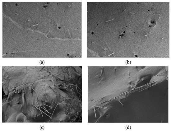 Distribution of fiberglass at the fracture when (a) fiber length is 3 mm, (b) fiber length is 6 mm, (c) fiber length is 9 mm and (d) fiber length is 12 mm.