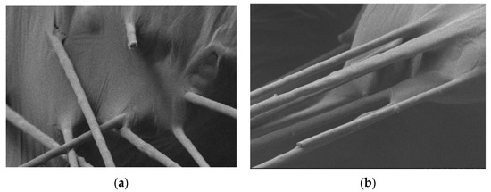 In order to study the bonding effect of the fiberglass and epoxy asphalt, the surface of the fiberglass-modified epoxy asphalt mastic was observed using SEM to examine the tensile fracture performance. The surface state of the extracted fiberglass and the binding of the root system to the epoxy asphalt were observed. The strength of the epoxy asphalt material depends on the 3-D network structure of the epoxy resin [20], so the bonding of the filler to the 3-D mesh structure of the epoxy resin can be observed by immersing the same tensile fracture surface samples in trichloroethylene for at least 12 h and dissolving the epoxy asphalt on the fracture surface of the sample, thus facilitating the observation of the bonding of the epoxy resin matrix to the fiberglass.