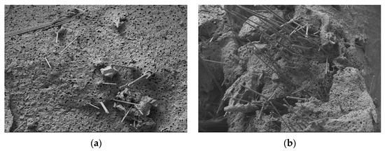 SEM image of the cross-section of epoxy asphalt mixture after etching with (a) spatial random distribution of fiberglass formation and (b) 12 mm fiberglass rolled into a ball.