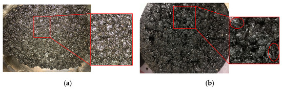 In the mixing process, it was found that the 3 mm and 6 mm glass fibers can be uniformly distributed in the mixture as monofilaments, while some of the 9 mm and 12 mm glass fibers would form clumps under the drive of the leaves, some of them were distributed in the mixture, and some were stuck on the leaves of the mixing pot. The clumping phenomenon of the 12 mm glass fibers was especially serious. Some of the glass fibers were distributed on the surface of the Marshall specimen during the forming process. The mixture specimens with a uniform and bundle distribution of glass fibers are shown in the Figure 9.