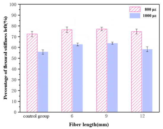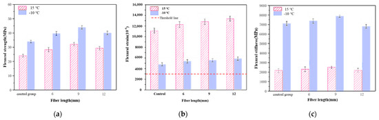 - The bending and tensile strengths of the epoxy asphalt mixtures with 6 mm, 9 mm and 12 mm fiberglass were 16.8%, 29.25% and 17.7% higher, respectively, than that of the control group at −10 °C. Compared with those in the control group, the final bending and tensile strain were 12.6%, 16.7% and 22.8% higher, respectively, and the bending stiffness modulus of the epoxy asphalt mixture was 3.7% and 10.7% higher, respectively, than that of the 6 mm and 9 mm fiberglass mixtures. The bending stiffness of the 12 mm fiberglass mixture was 4.1% lower than that of the control group.