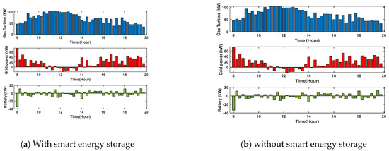 The system optimization scheduling process in the two cases is shown in Figure 4 and Figure 5. Figure 4a,b compares the two dispatching scenarios. In the gas-fired power generation without smart energy storage, the most significant variation is in the external temperature and light intensity, which occurs when the system is operating in the mode of constant heat and electricity. In the low electricity price period, in order to reduce the gas cost when the smart energy storage participates in the scheduling, the gas turbine output is relatively small. During the high electricity price period in the afternoon, both systems will sell electricity to the grid to obtain benefits. However, after the smart energy storage participates in the scheduling, the gas turbine can be further increased. This is because the strong constraints on indoor temperature will be lifted when the smart energy storage participates in scheduling.