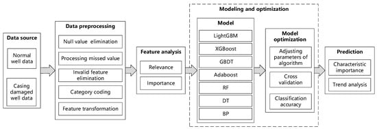 Multiple intelligent algorithms were adopted to construct an intelligent predictive model of casing damage using geology, engineering, development, and production data through the quantitative identification of the main controlling factors. The workflow comprises five steps, as described below and shown in Figure 1.