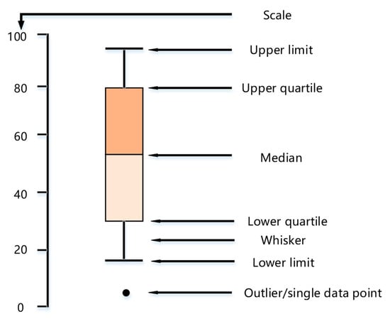 - Box-plot visualization: A data distribution can be visualized using five statistical values of the data, namely the minimum, upper quartile, median, lower quartile, and maximum, as shown in Figure 2. This box-plot visualization is unaffected by outliers and shows whether the data are roughly symmetry, accurately and stably describes the discrete distribution of the data, especially for the comparison of several types of samples, and is conducive to data cleaning.